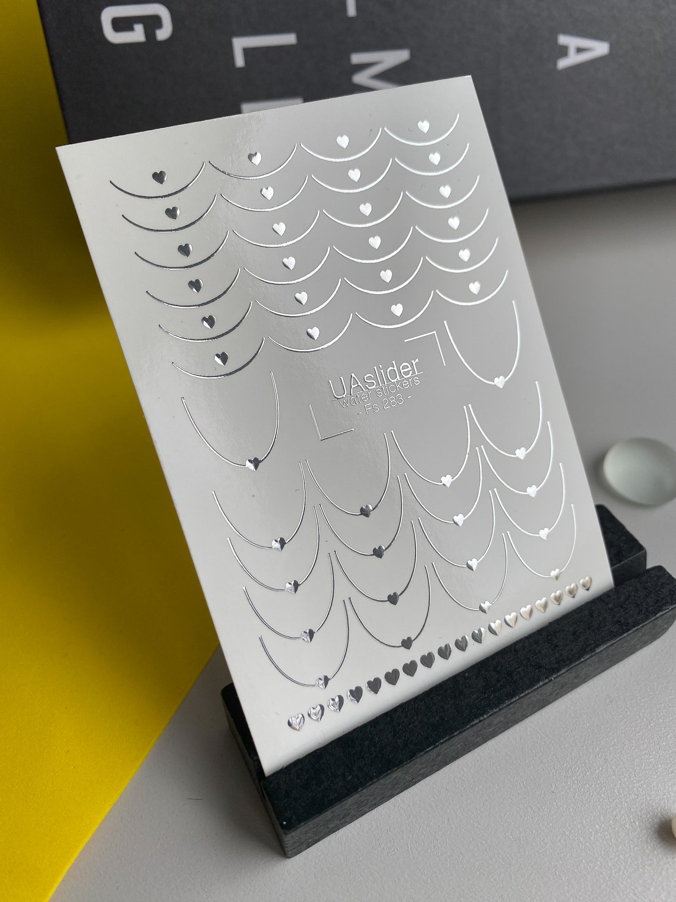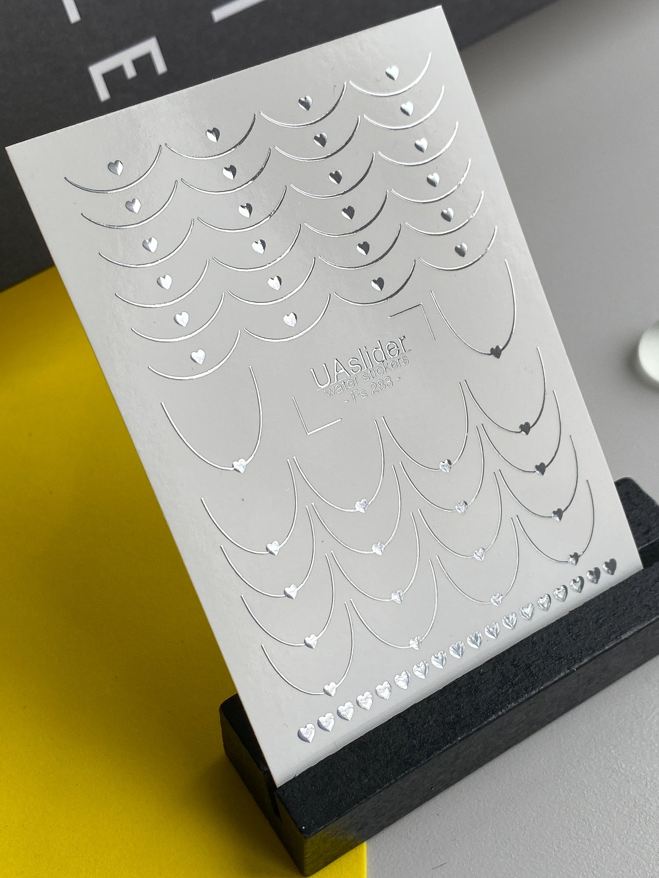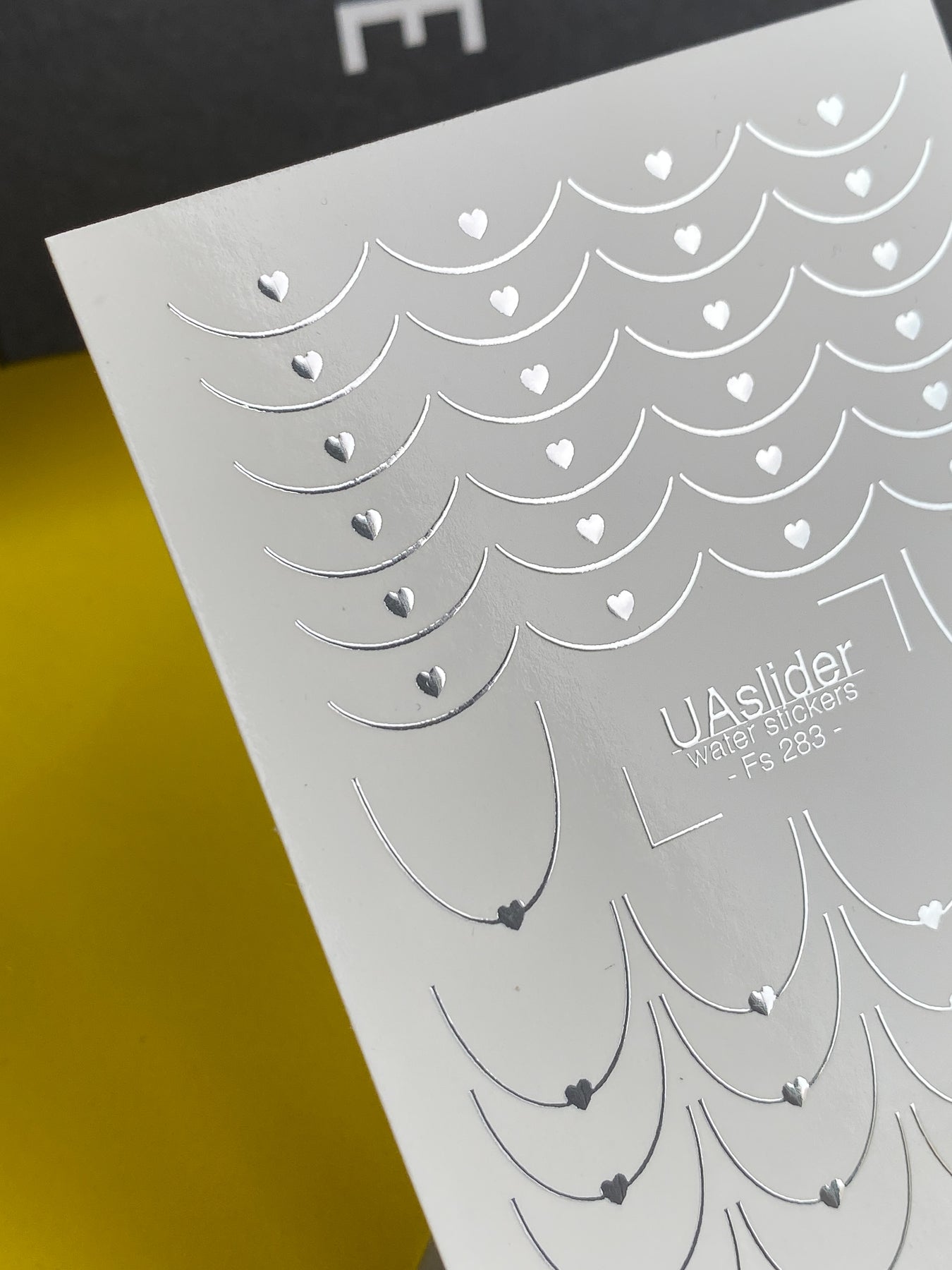 Delicate water slide nail decals with silver foil heart chains and curved arc ornaments. These Nail Water Decals apply easily — soak in water and transfer onto your nails.