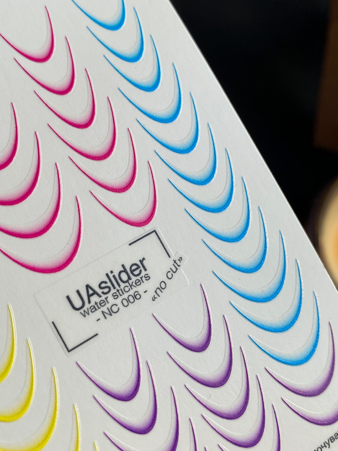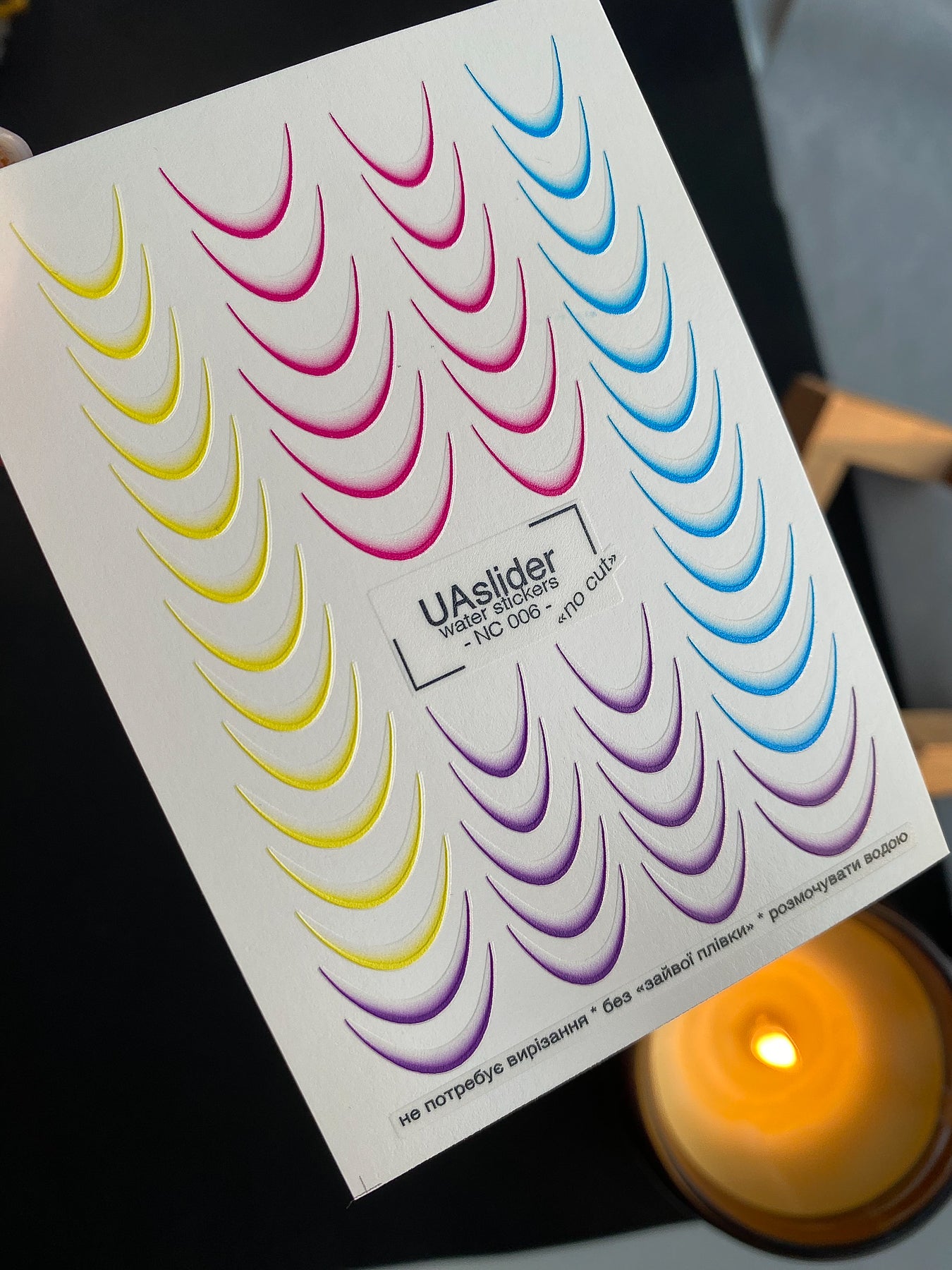 Vibrant French water slide nail decals in multicolor gradient tones — yellow, pink, blue, and purple smile lines for playful and trendy French manicures. These nail water decals are water-activated — soak in warm water and the design slides off smoothly for application. Cutting is not required, but trimming can be done for convenience. Each piece releases in water and transfers evenly onto the nail surface. Perfect for salon-quality nail art or DIY colorful French tips at home.