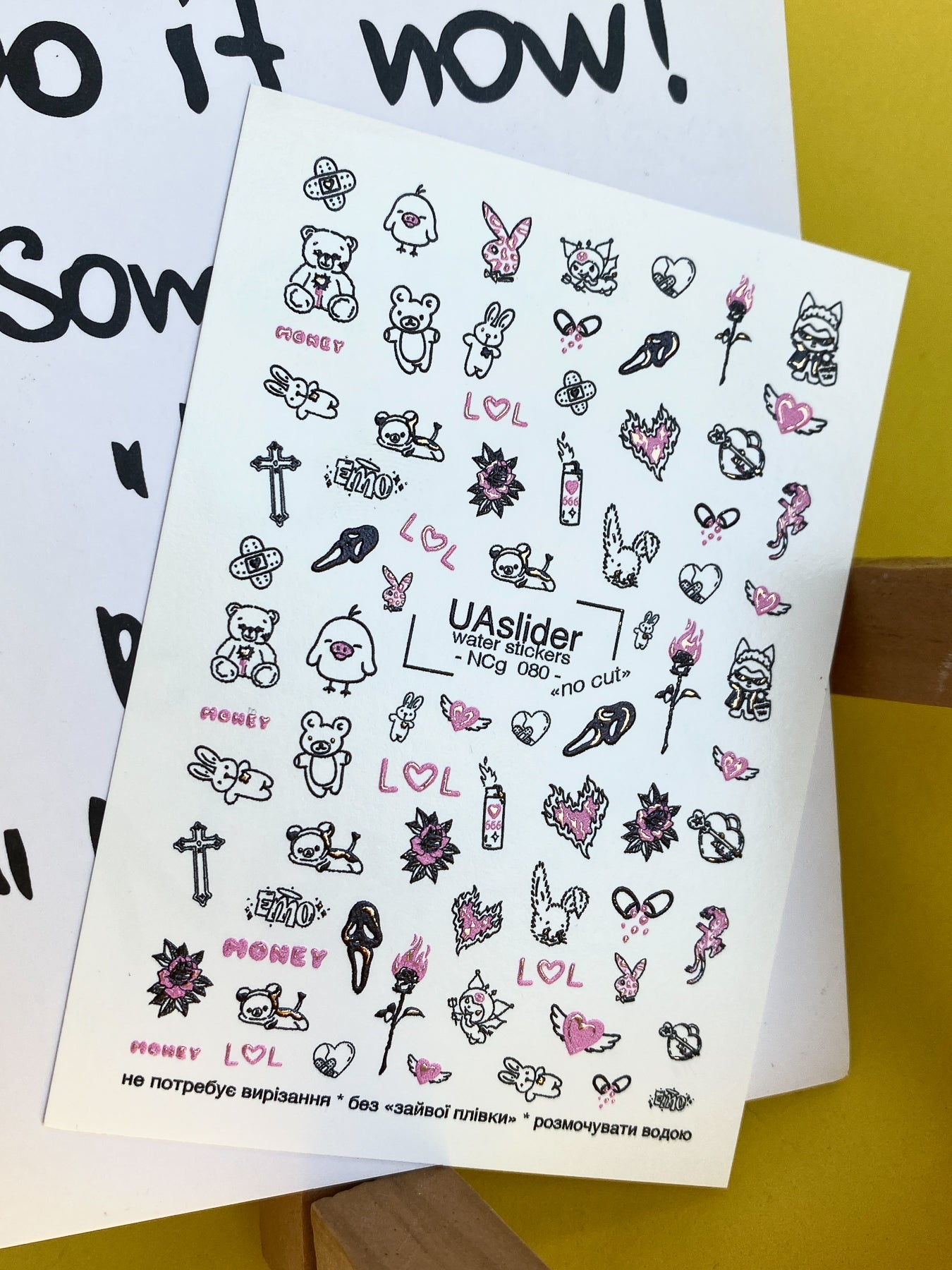 Nail Water Decal NCg-080 | Water Slide Nail Decals Emo Style | Bears, Hearts and Cute Dark IconsNCg_080