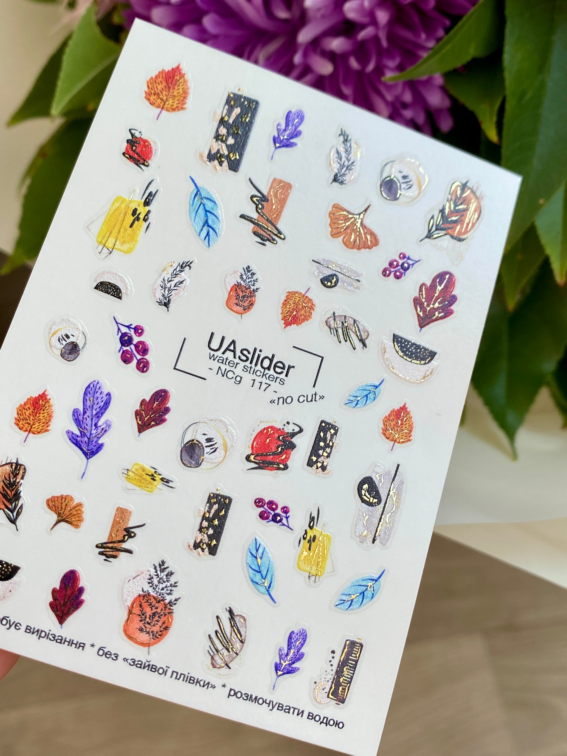 Autumn-inspired water slide nail decals with colorful leaves, berries, and abstract fall motifs. These nail water decals are water-activated — just soak to apply. The designs release in water and slide smoothly onto the nail surface, creating an effortless seasonal manicure.