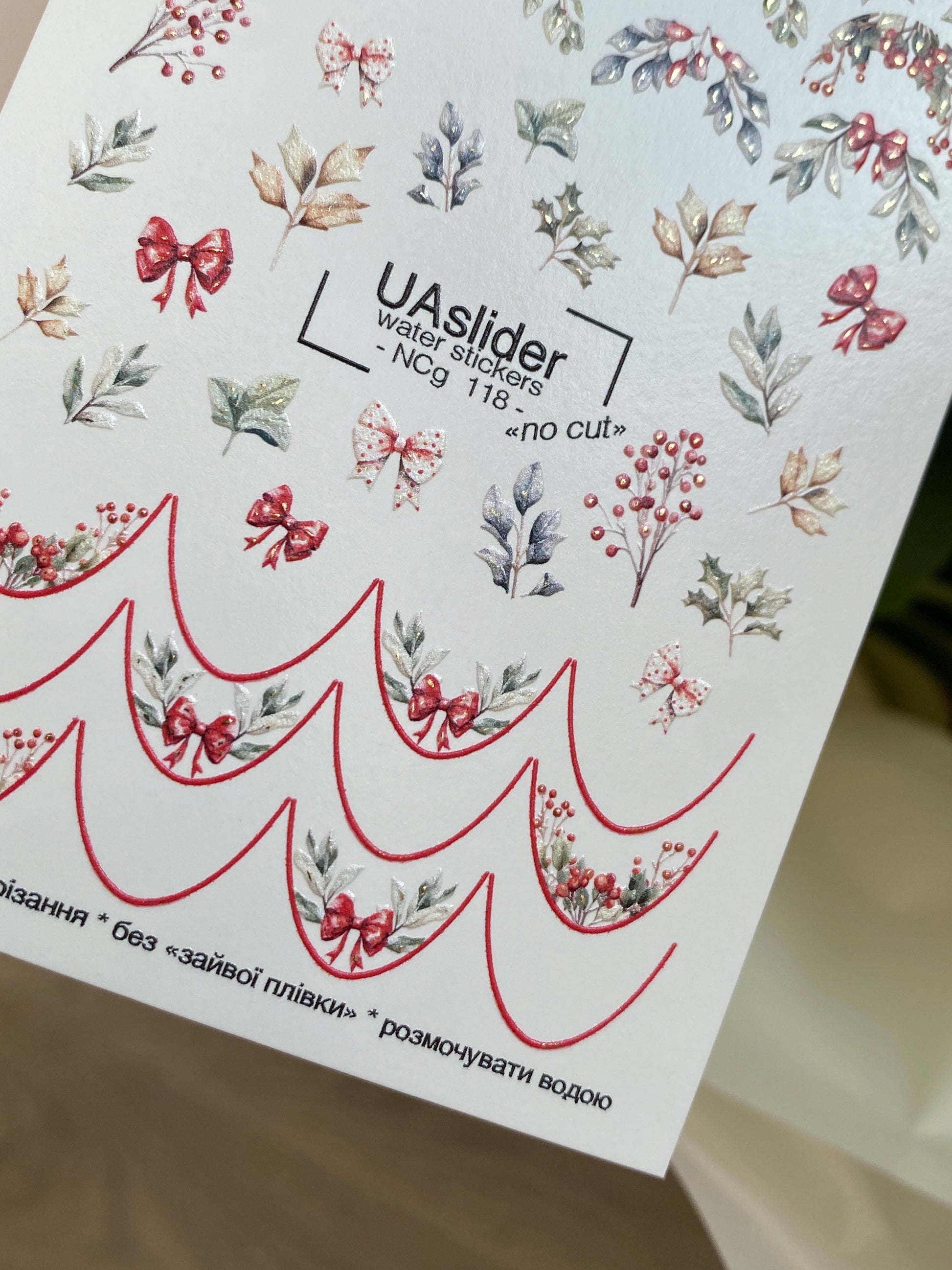 Festive water slide nail decals featuring winter berries, holly leaves, and decorative bows. These nail water decals are water-activated — just dip the design in water and it slides off effortlessly onto the nail surface.