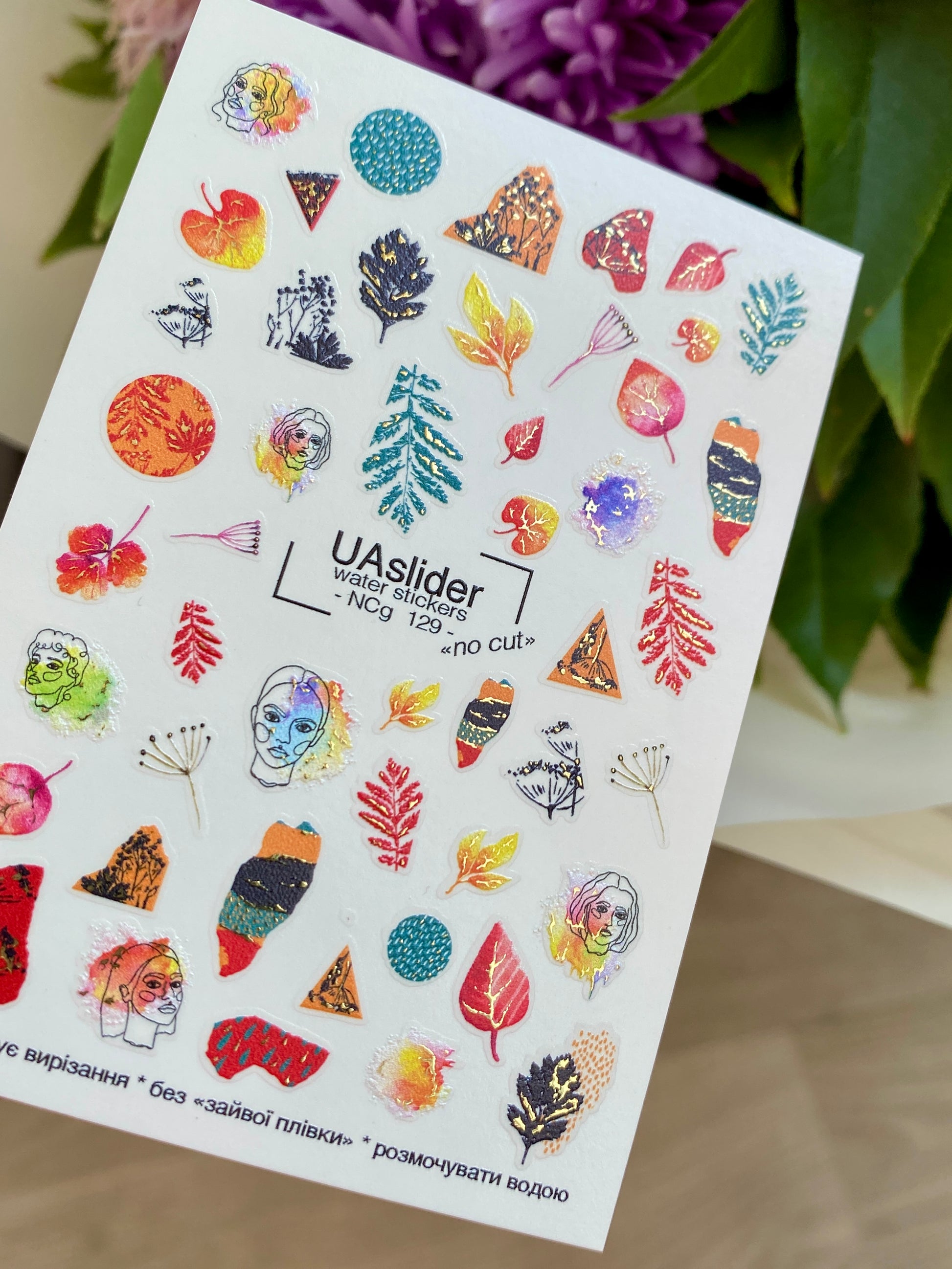 Unique water slide nail decals featuring abstract faces, colorful leaves, and modern geometric accents. These water transfer nail decals are water-activated — soak to apply, and the designs slide smoothly onto the nail surface.