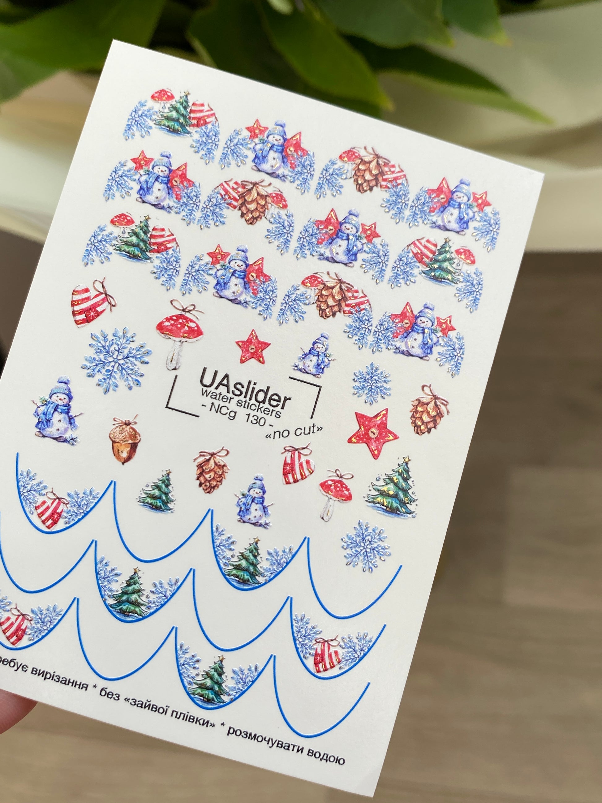 Festive water slide nail decals featuring cheerful snowmen, Christmas trees, snowflakes, and holiday decorations. These nail water decals are water-activated — soak to apply, and the designs slide smoothly onto the nail surface.
