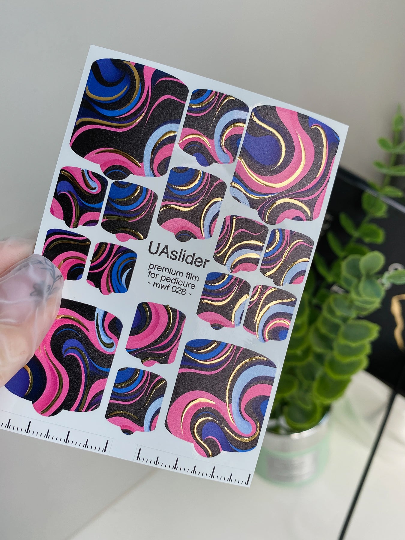 Add a touch of retro glamour with these Nail Wrap Films for pedicure in stylish pink, blue, and black swirls highlighted by elegant gold foil lines. The flowing pattern creates a playful yet sophisticated look, perfect for summer or artistic nail designs.