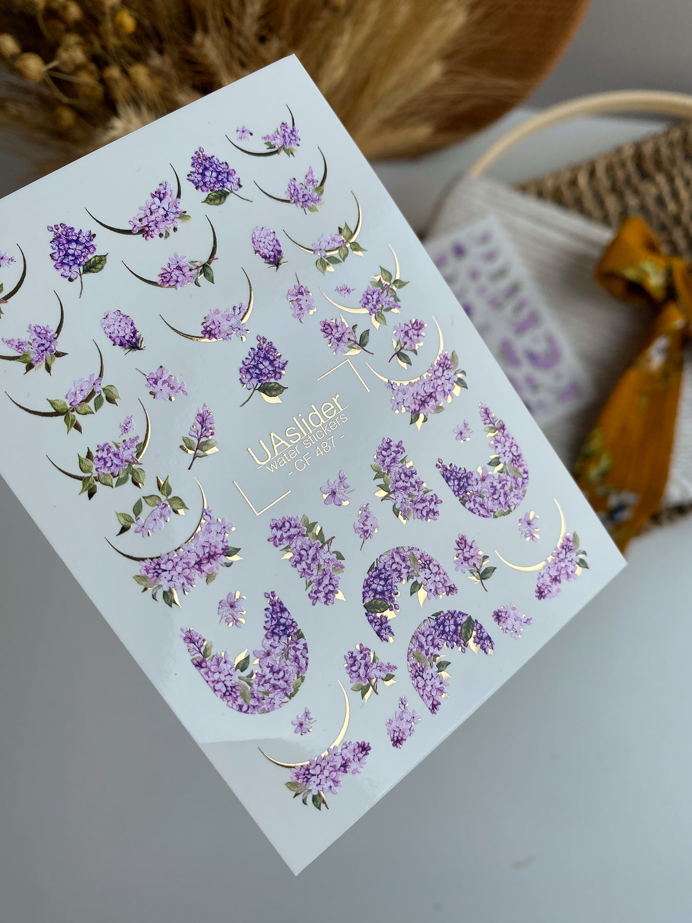 Adesivo de Água para Unhas CF-487 | Adesivos de Água para Unhas Flor de Lilás com Detalhes Dourados | Design FloralCF_487