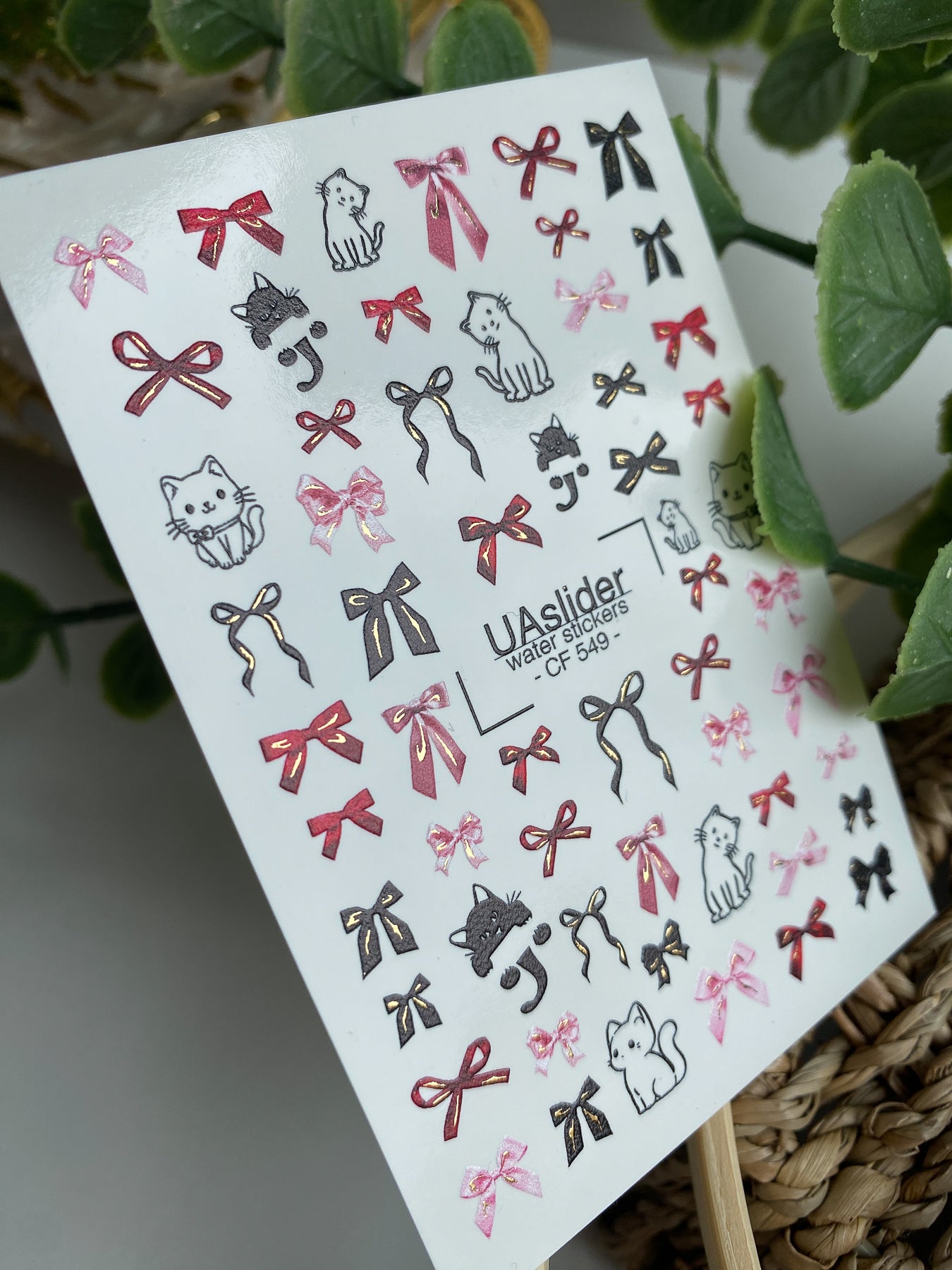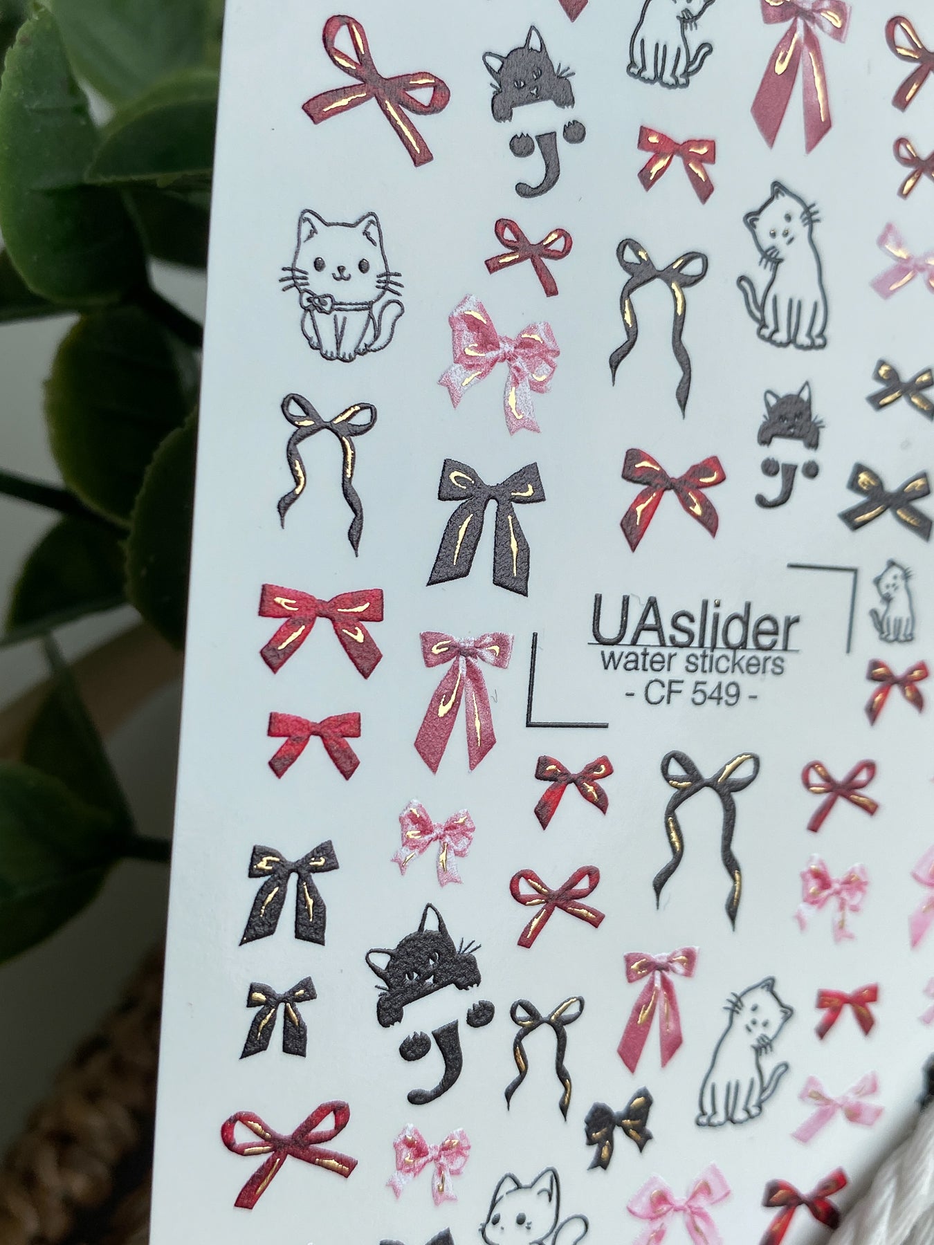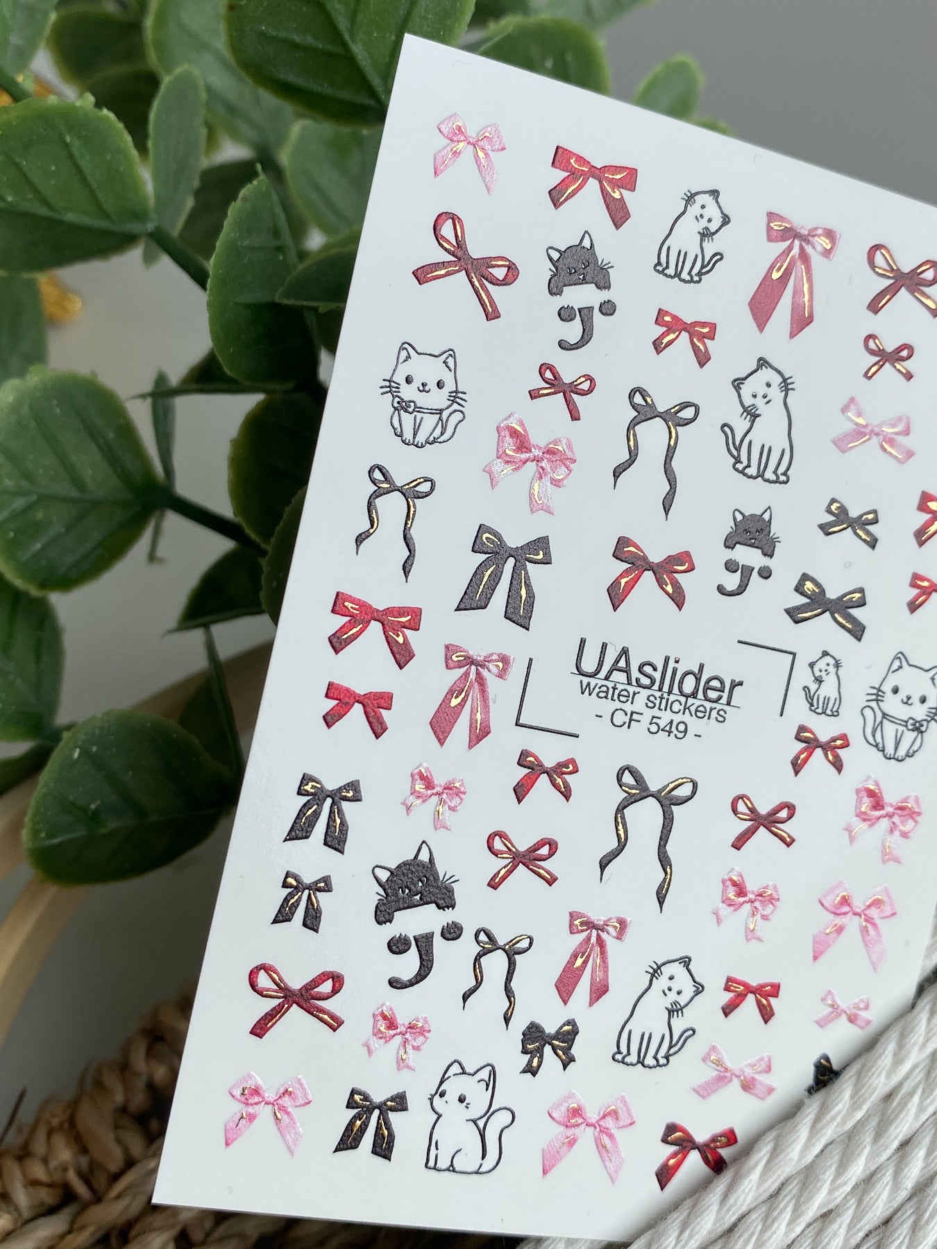 Decalcomanii de apă pentru unghii CF-549 | Decalcomanii drăguțe pentru unghii cu pisică și fundă | Autocolante de apă roșii, roz și negreCF_549