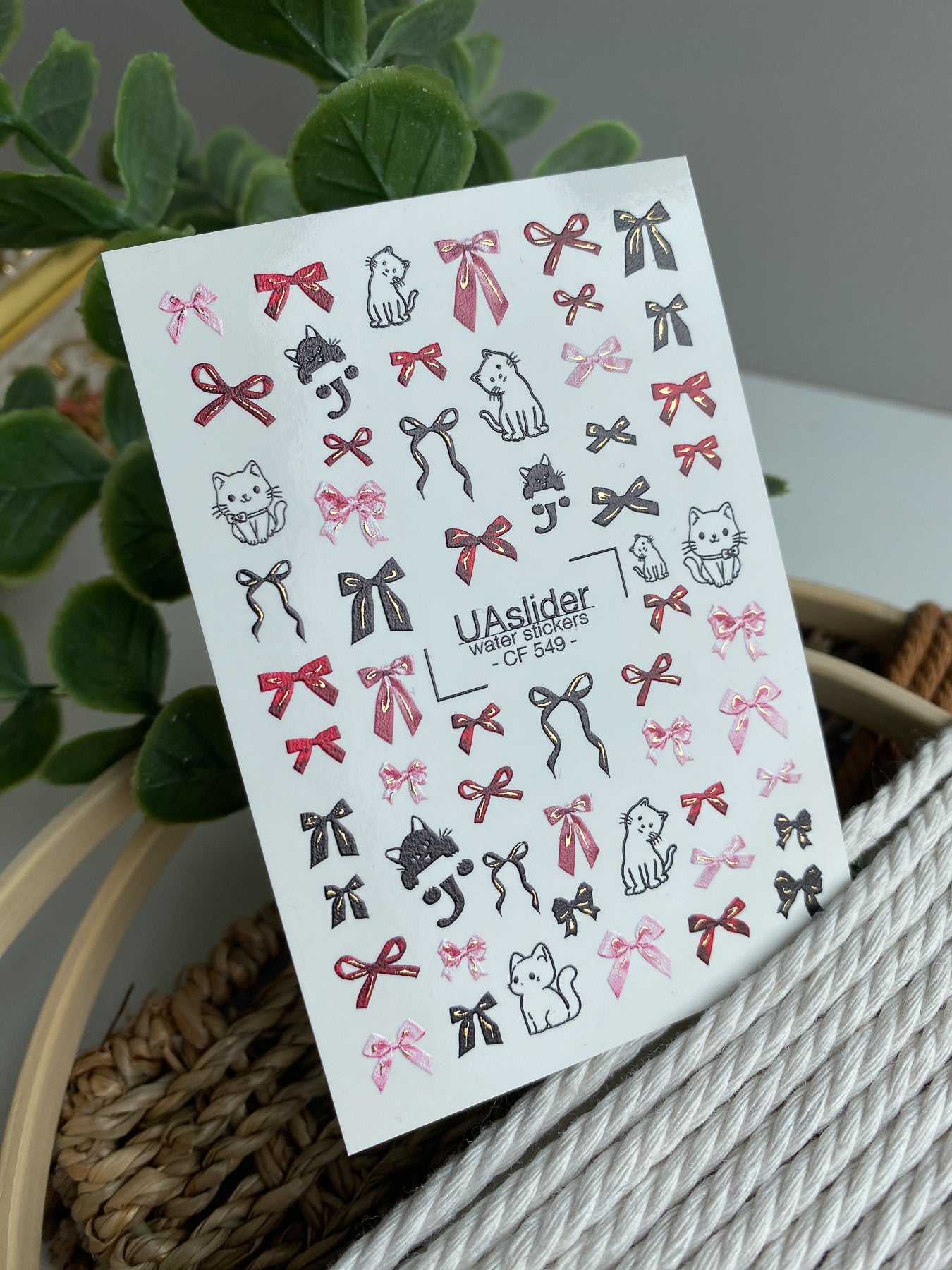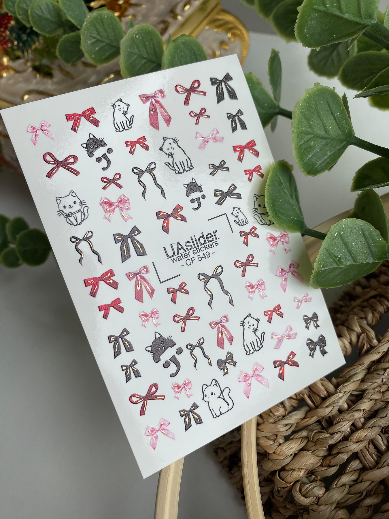 Decalcomanii de apă pentru unghii CF-549 | Decalcomanii drăguțe pentru unghii cu pisică și fundă | Autocolante de apă roșii, roz și negre