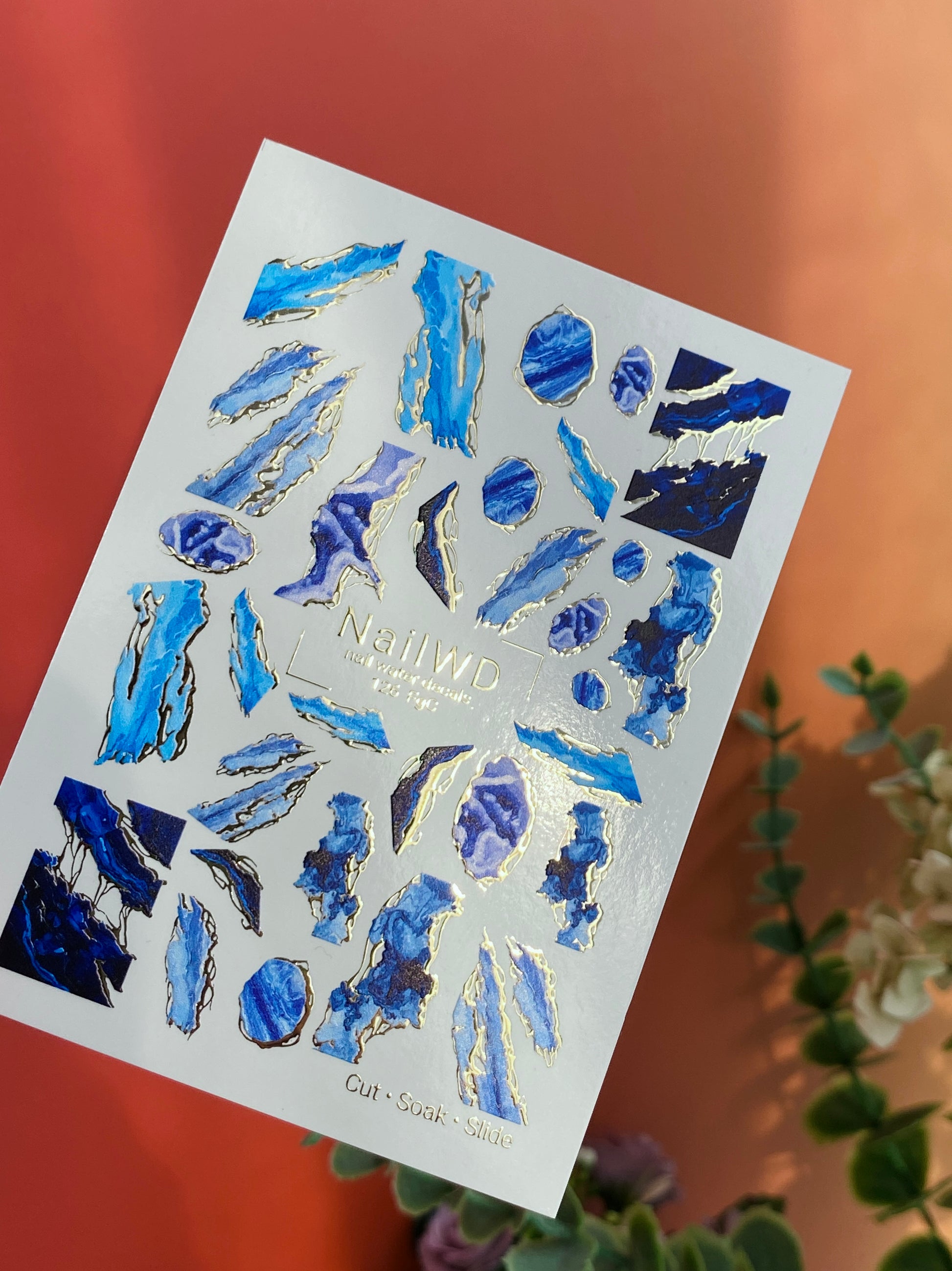 Потрясающие синие агатовые водные переводные наклейки для ногтей с мерцающими золотыми краями для роскошного эффекта драгоценного камня. Эти водные наклейки активируются водой — просто замочите для нанесения, и каждая деталь легко отделяется в воде, плавно скользя по ногтю.